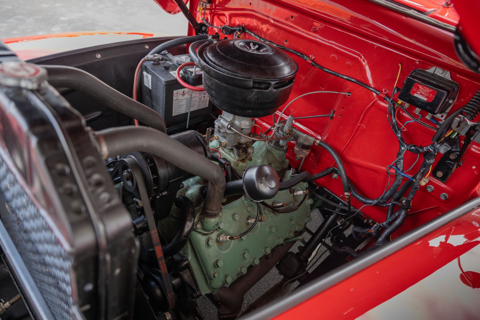 Prezentowany egzemplarz F-1 to model z ostatniego roku produkcji pierwszej generacji. Odrestaurowany z dbałością o detale, zachwyca nie tylko oryginalnością, ale też starannym wykończeniem. Choć pierwotnie opuścił fabrykę w kolorze Sandpiper Beige, dziś przyciąga wzrok intensywnym odcieniem Vermillion – również autentycznym dla tego rocznika. Wnętrze, wykończone z czerwonymi akcentami, zawiera oryginalne wskaźniki, radio oraz ogrzewanie. Zmieniona kierownica trzyramienna może zostać łatwo wymieniona na oryginalny model, który jest częścią zestawu.