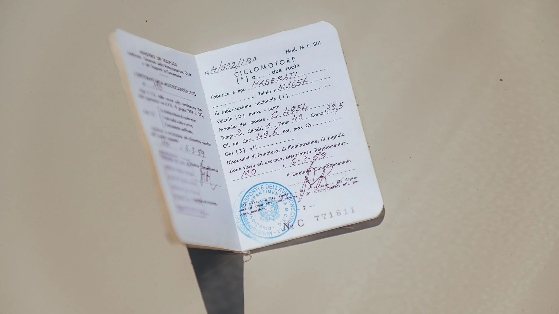 Prezentowany egzemplarz zachował oryginalny silnik i został pieczołowicie odrestaurowany. Co więcej, towarzyszy mu oryginalny dokument na wzór dzisiejszego dowodu rejestracyjnego – „Certificato per ciclomotore” z 6 marca 1959 roku, który dodaje autentyczności i historycznej wartości.