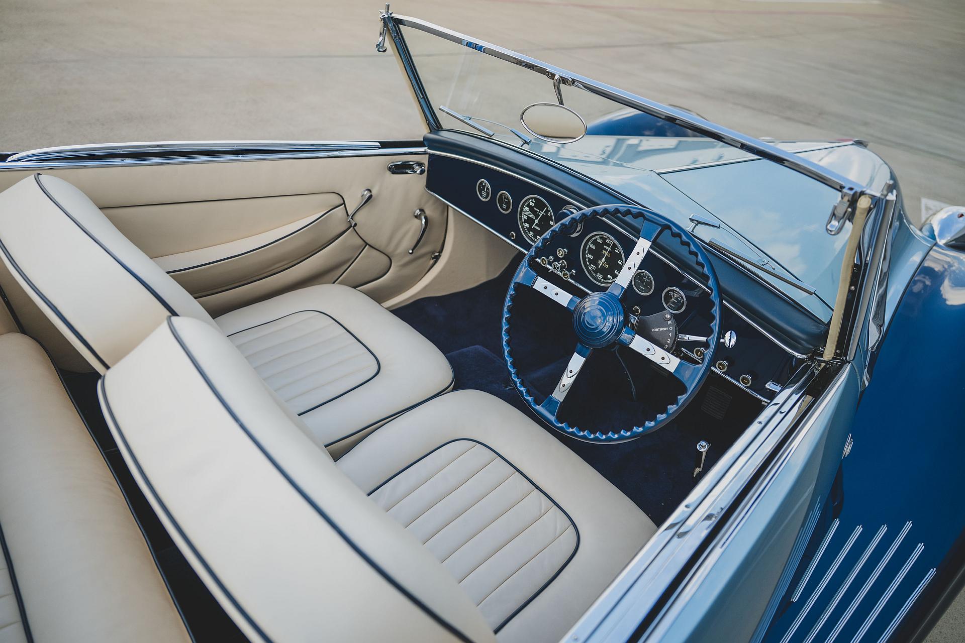 Jednym z nich jest prezentowany egzemplarz – wyjątkowy kabriolet zaprojektowany przez Figoni et Falaschi. Zamówiony w 1947 roku, prawdopodobnie przez amerykańskiego kolekcjonera Louisa Rittera, zachwycał odważną formą: falującymi błotnikami inspirowanymi lotnictwem, chromowaną atrapą chłodnicy o geometrycznym wzorze oraz detalami w duchu Art Déco. Całość tworzyła harmonijną, opływową sylwetkę, będącą kwintesencją francuskiej „linii łuku”.